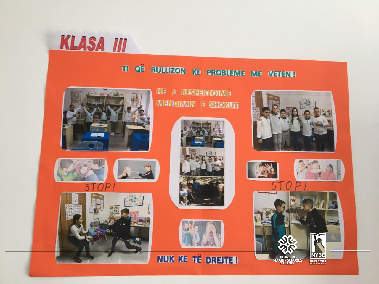 Në kuadër të strategjisë “STOP BULLIZMIT”, psikologia e shkollës Ana Vrapi në bashkëpunim me Drejtorinë e shkollës në New York Basic Education, qeverinë e nxënësve dhe mësuesit kujdestar, organizuan aktivitetitin me klasën e 3-të, 4-të dhe të 5-të. Klasat ishin në konkurim me njëra-tjetrën për posterin dhe performancën më të mirë.