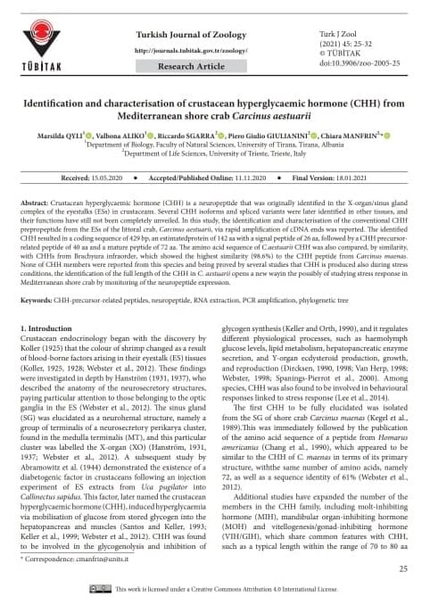 Artikulli me titull ‘Identification and characterisation of crustacean hyperglycaemic hormone (CHH) from Mediterranean shore crab Carcinus aestuarii” është botuar në revistën e mirënjohur turke, “TÙBITAK” të specifikuar si Turkish Journal Of Zoology, e cila ka dhe faktor impakti.